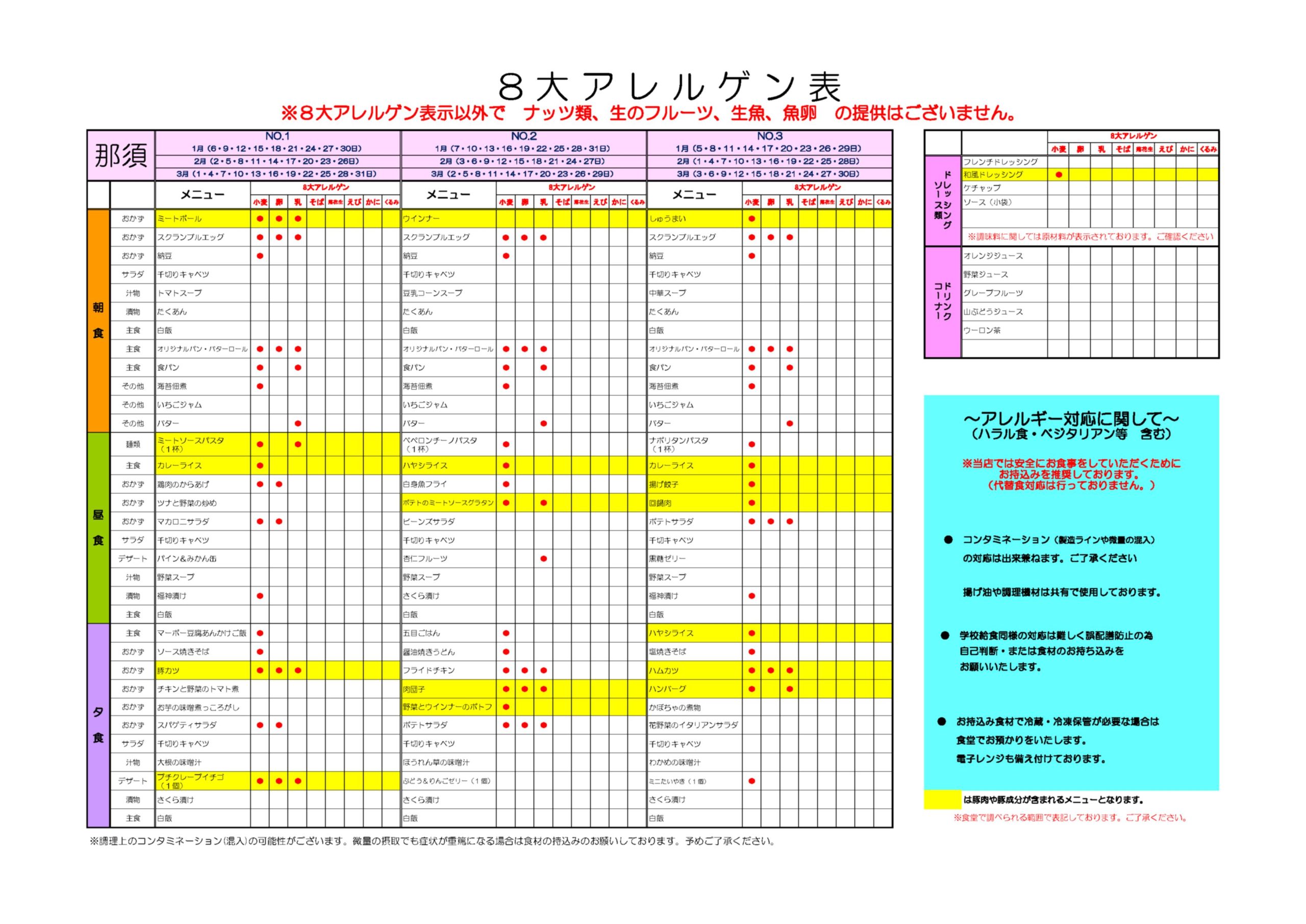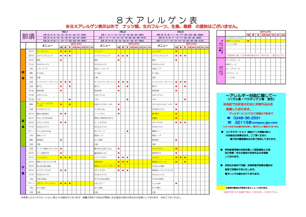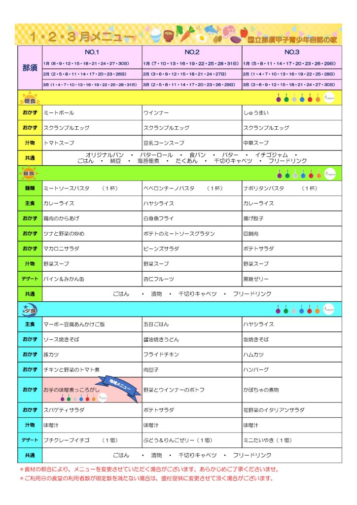 2026年 1・2・3月 献立表とアレルゲン 食堂の献立 詳細はこちら アレルゲン表 詳細はこちら 2026年 4・5・6月 献立表とアレルゲン 食堂の献立 詳細はこちら アレルゲン表 詳細はこちら お弁当メニュー 詳細はこちら 野外炊事 アレルゲン、材料表が必要な方は、コンパスグループ・ジャパン㈱那須甲子店(32113@compass-jpn.com)にお問合せください。