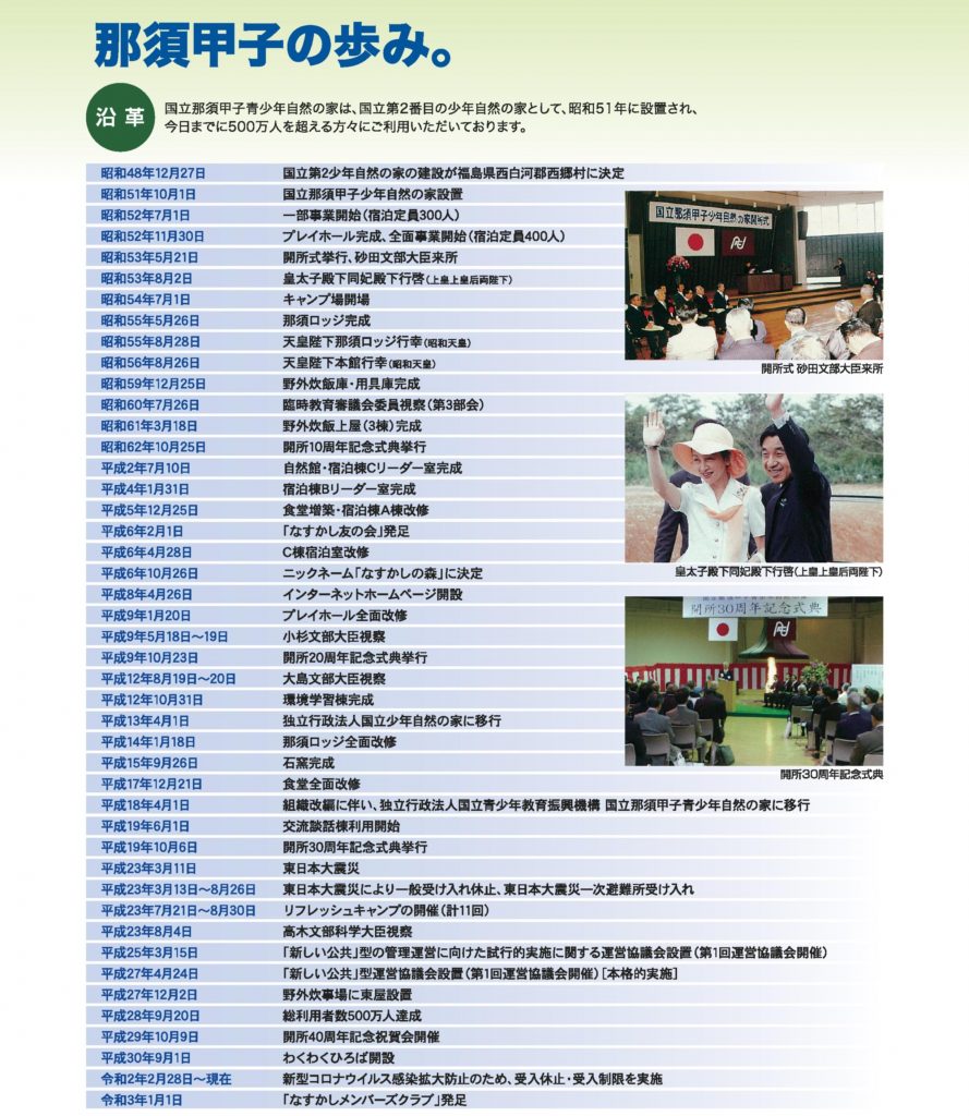 当施設は文部省(当時)の学制百年記念事業の一環として、21世紀にはばたく少年のために設置された全国14ヶ所ある国立少年自然の家の第2番目として、昭和51年10月に設置されました。平成13年4月には独立行政法人国立少年自然の家国立那須甲子少年自然の家、平成18年4月には独立行政法人国立オリンピック記念青少年総合センター、独立行政法人国立青年の家と統合し、独立行政法人国立青少年教育振興機構国立那須甲子青少年自然の家となりました。全国に27ある地方施設の1つとして「体験活動を通した青少年の自立」を目指して多様な体験活動の提供に努めています。